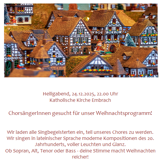 Wir proben jeweils am Dienstag um 19:50 bis 21:20 Uhr im katholischen Kirchenzentrum.